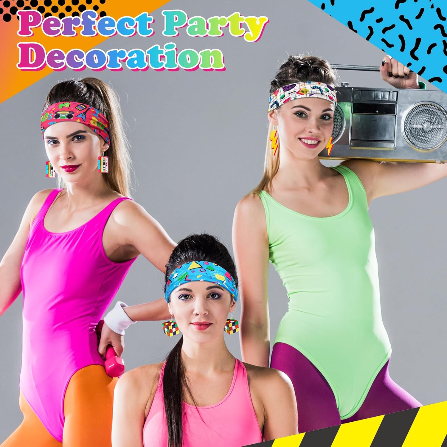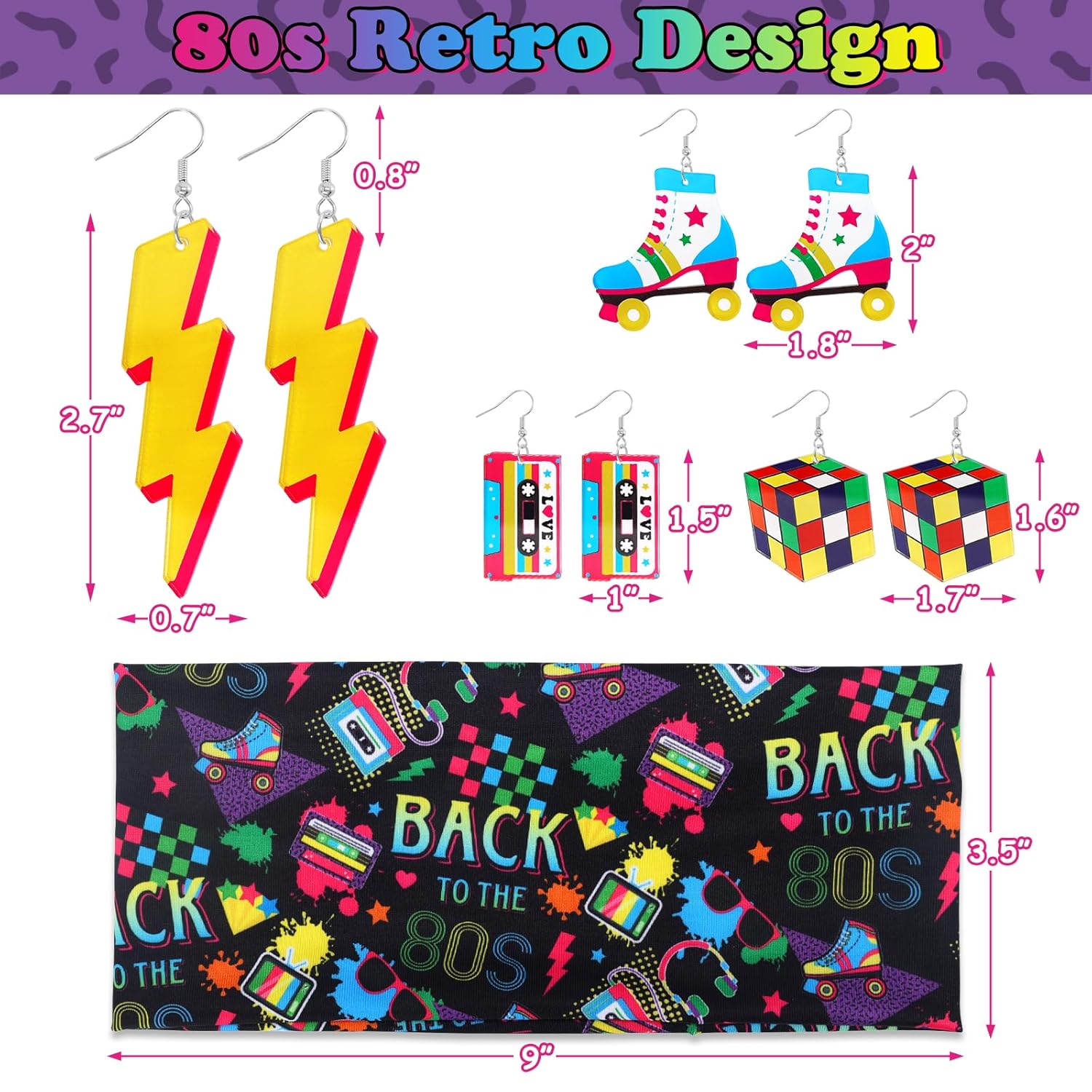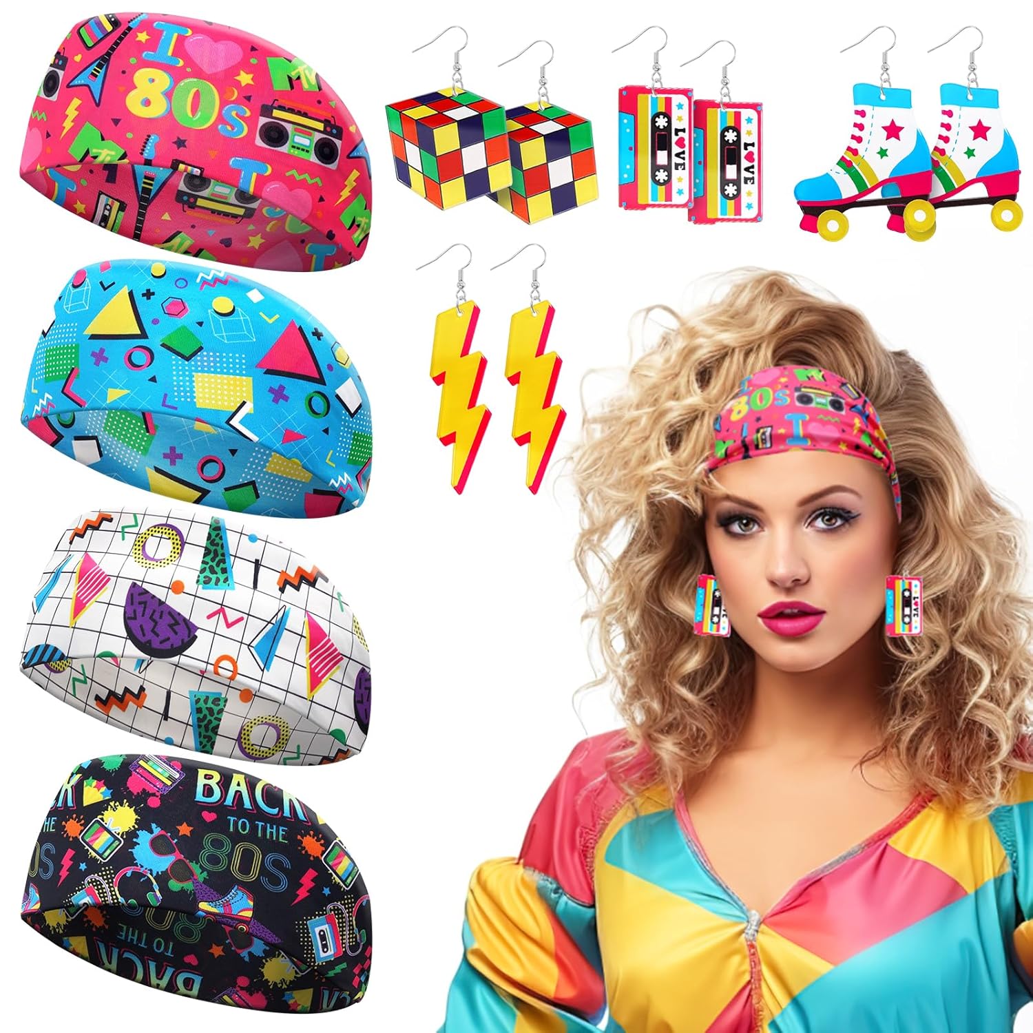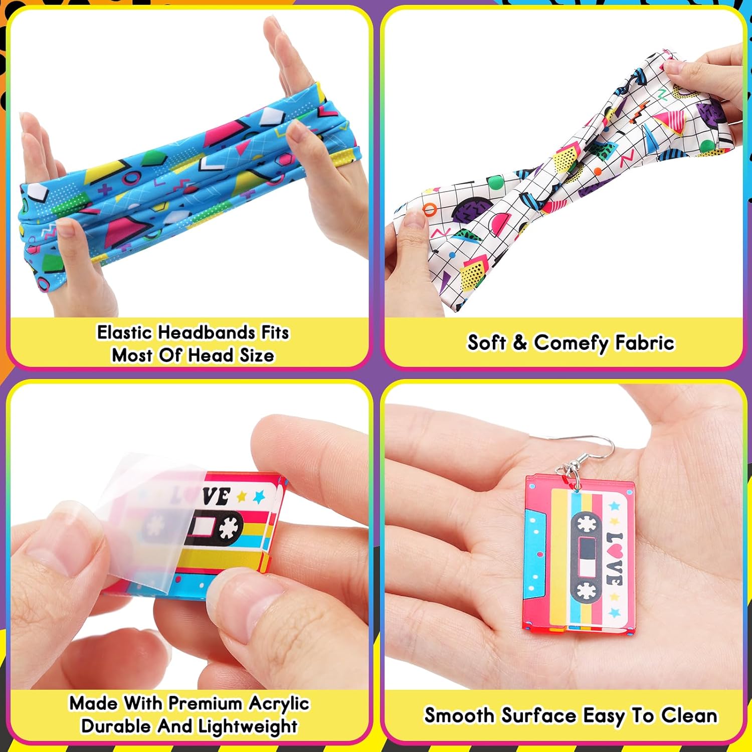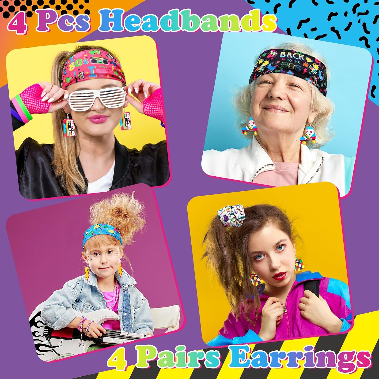 4 Pairs 80S 90S Retro Earrings & 4 Pcs Headbands 80S Stylish Accessories For Women Girl Neon Earrings Cassette Tape Acrylic Drop Dangle 90S Hair Accessories Vintage Headbands Soft Elastic Sweat