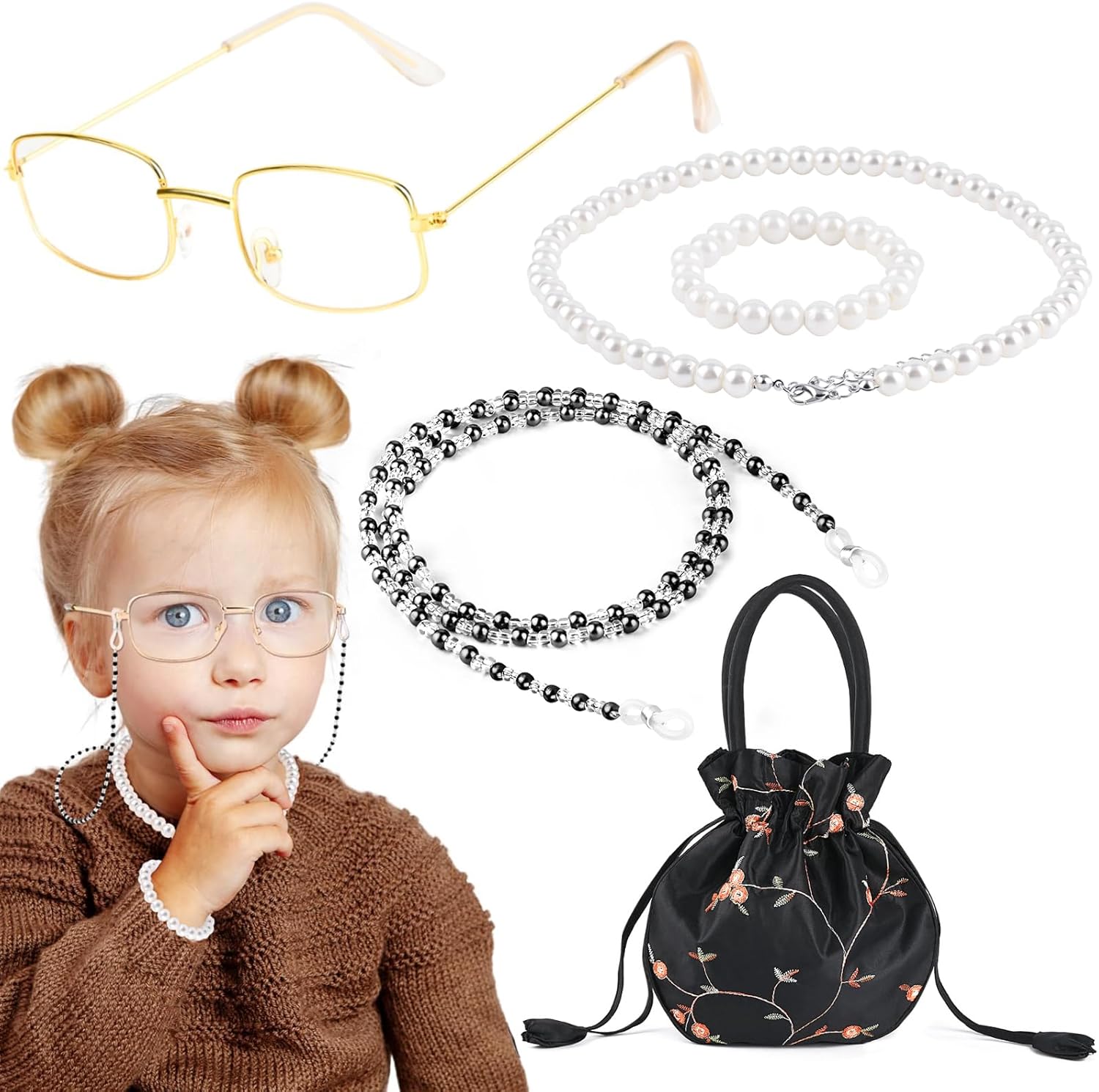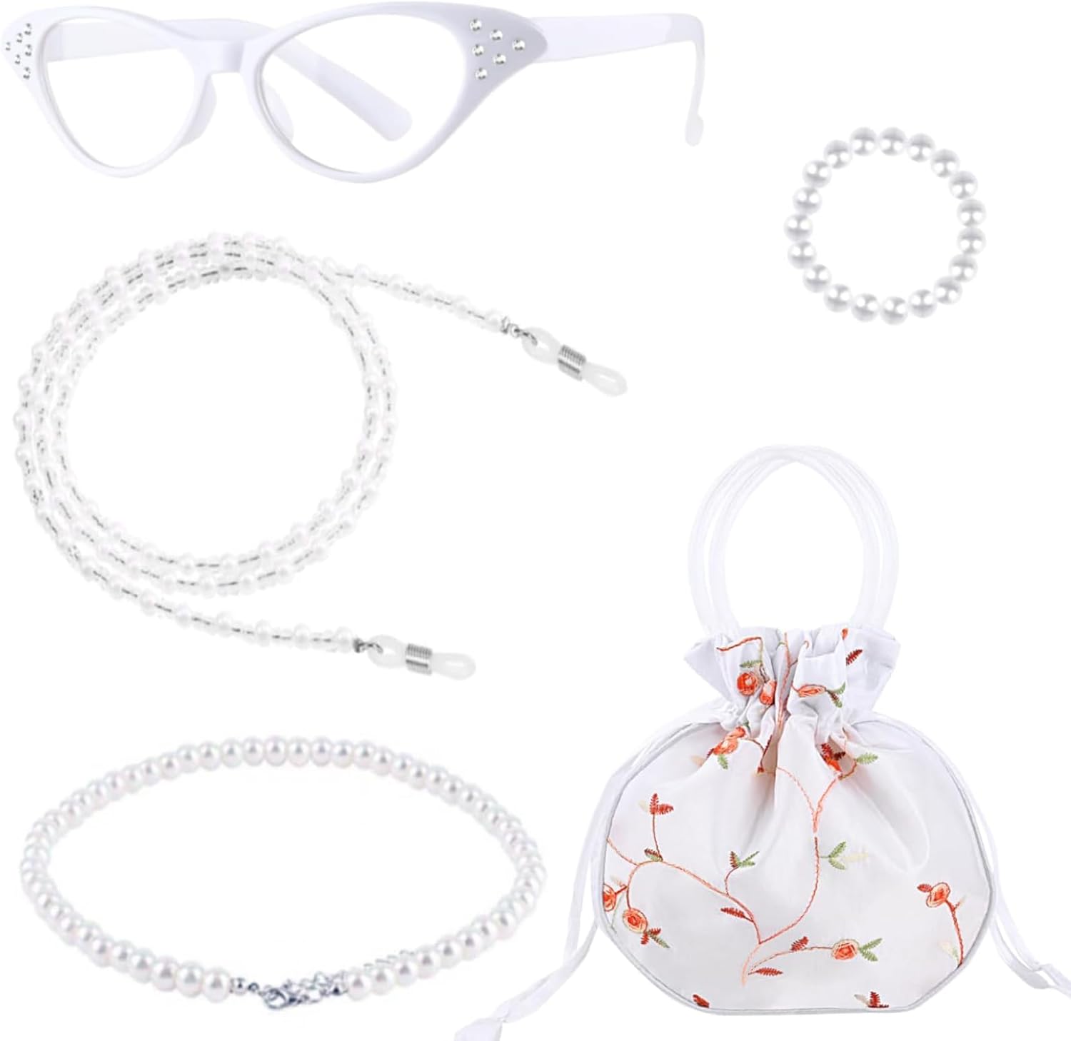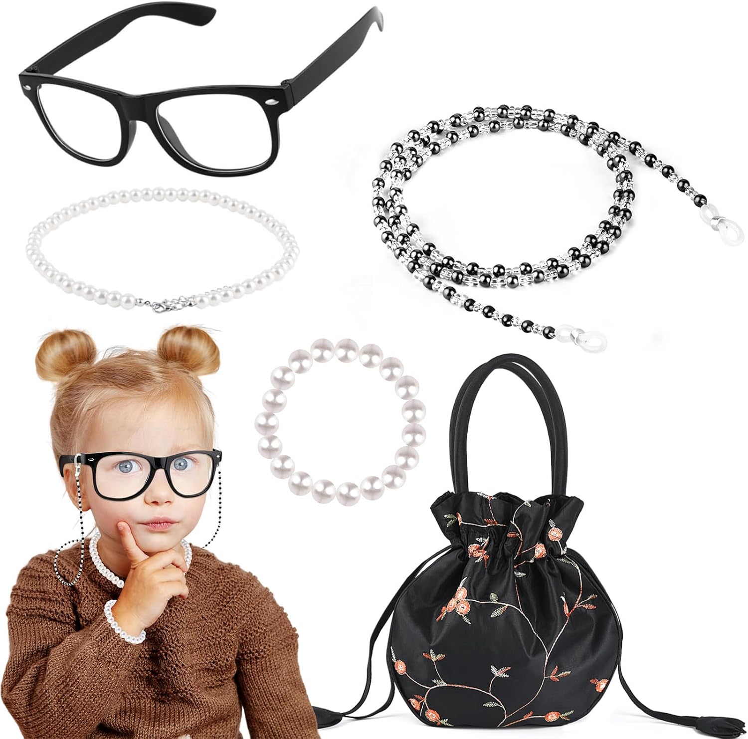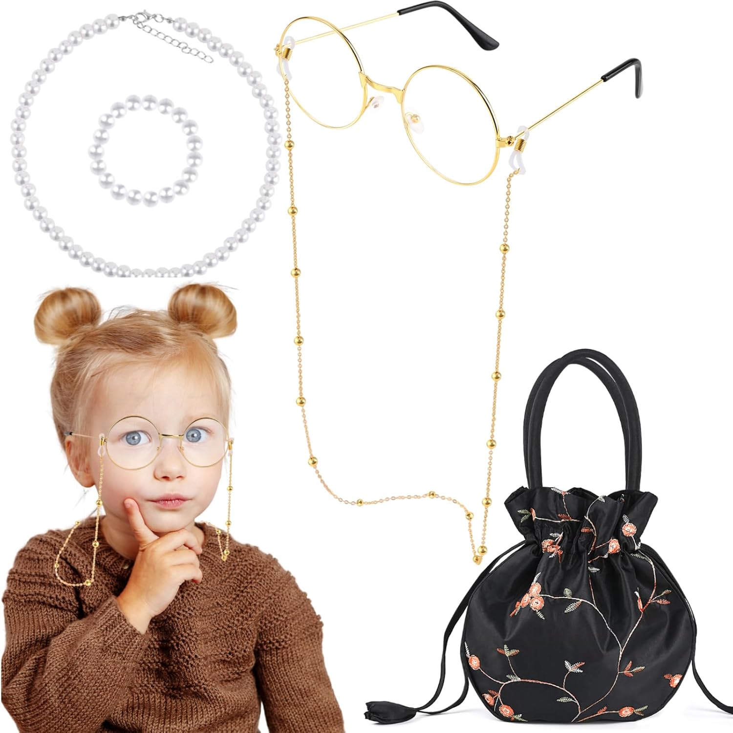 【Fabulous Old Lady Accessories】you will receive a pair of old lady glasses,1 piece of glasses chain,1 piece of artificial pearl necklace,1 piece of artificial pearl bracelet and 1 embroidered handbag,ideal combination for your old lady dress,you can dress up with your friends, it seem to be the age of grandmothers when you wear these cute granny costume accessories.