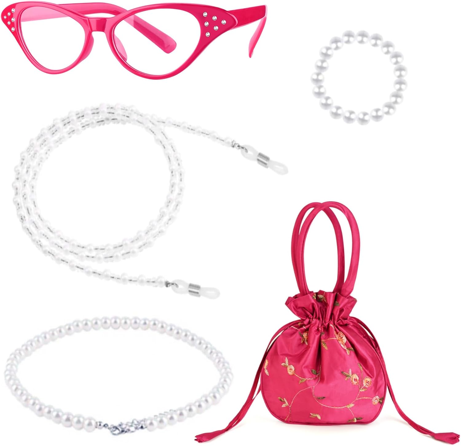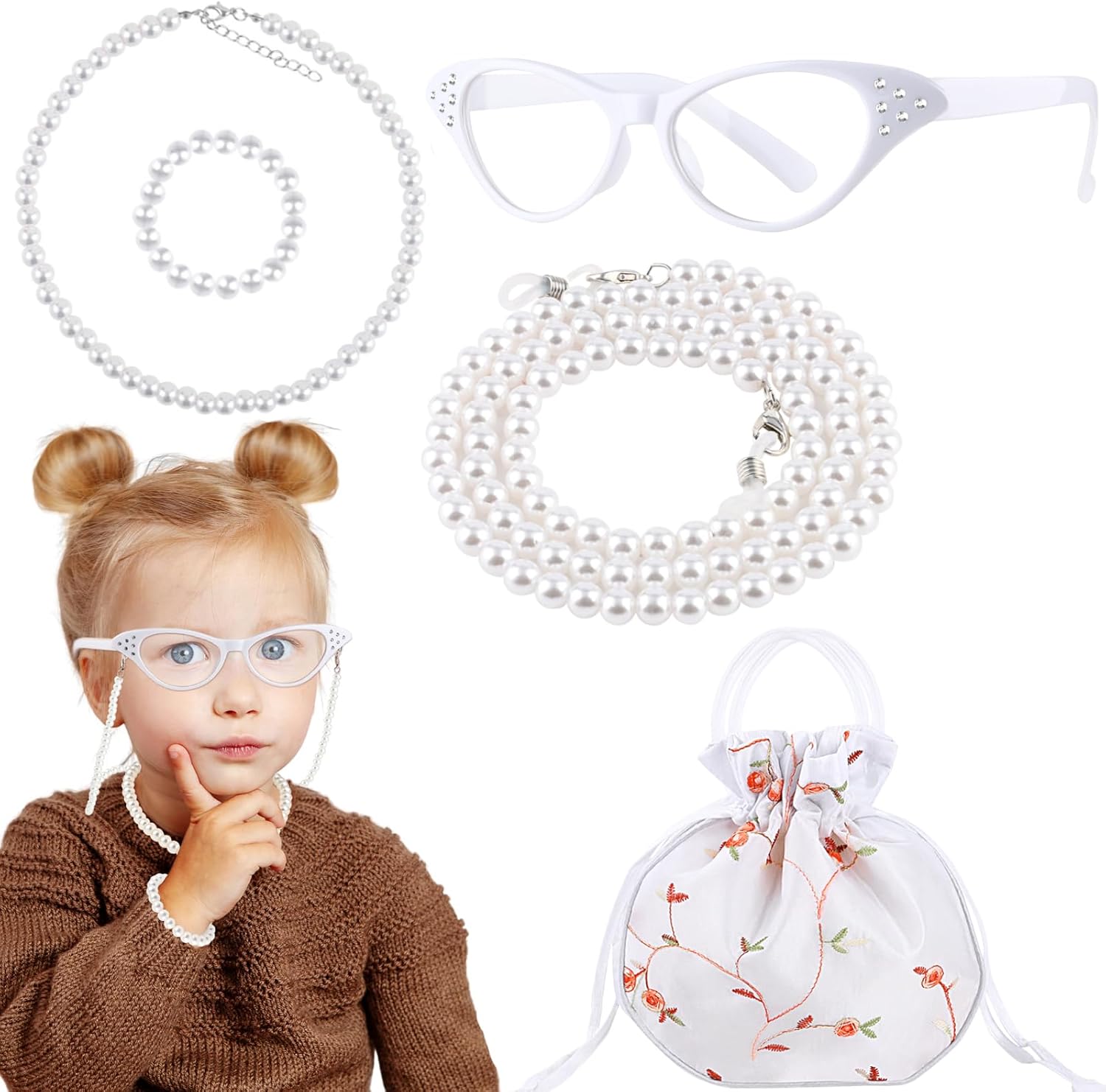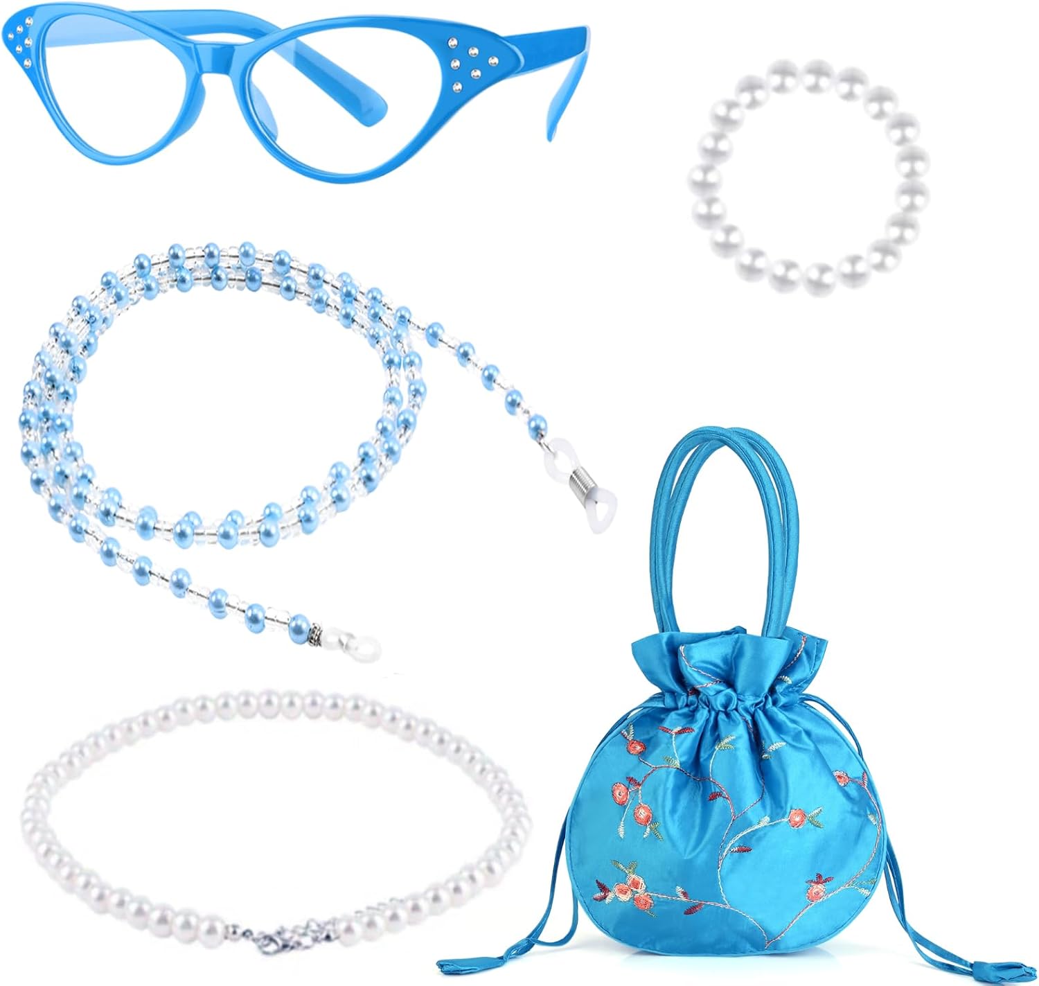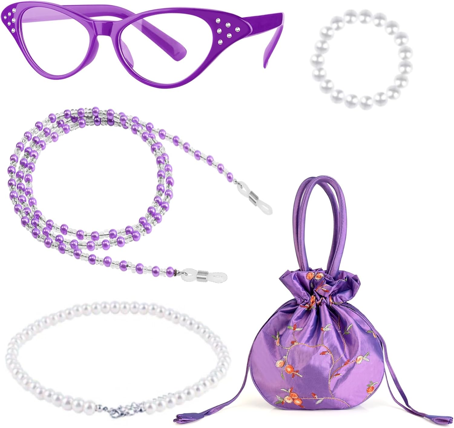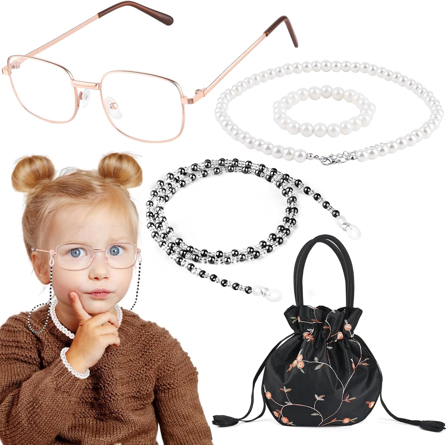 【Fabulous Old Lady Accessories】you will receive a pair of old lady glasses,1 piece of glasses chain,1 piece of artificial pearl necklace,1 piece of artificial pearl bracelet and 1 embroidered handbag,ideal combination for your old lady dress,you can dress up with your friends, it seem to be the age of grandmothers when you wear these cute granny costume accessories.