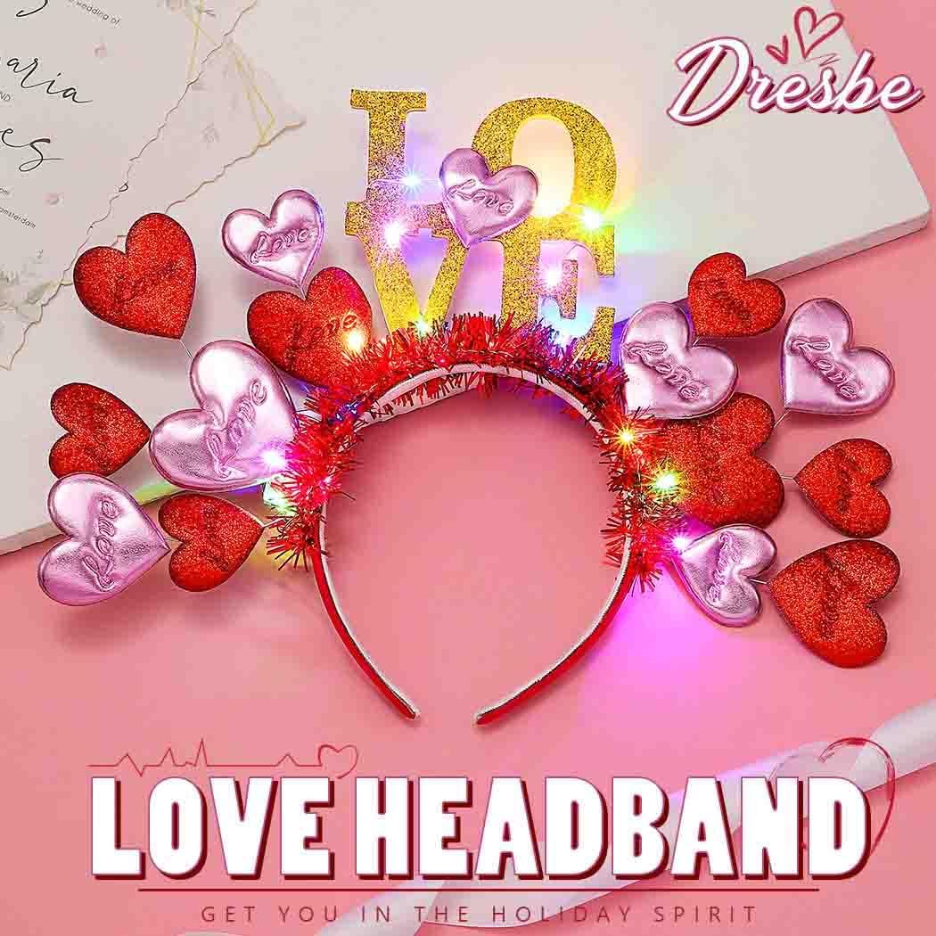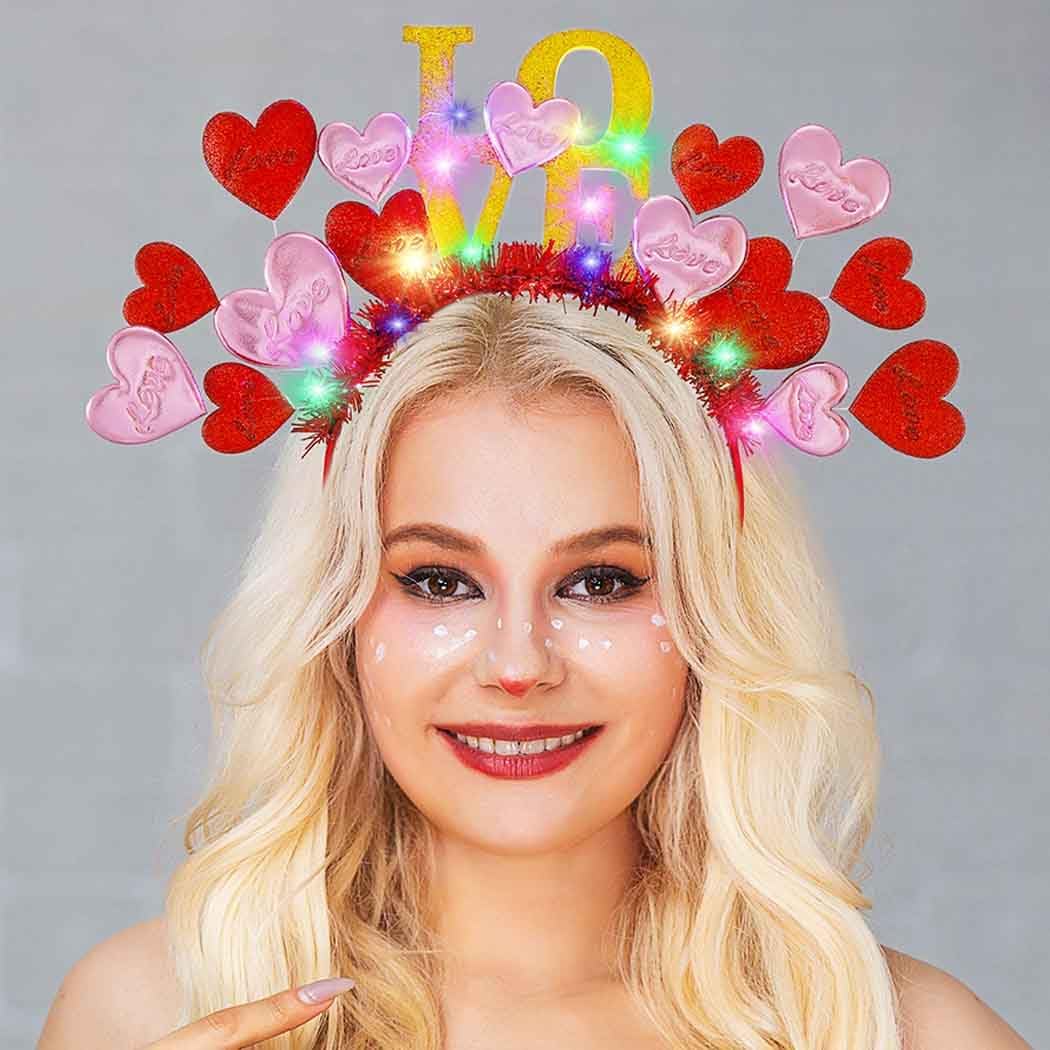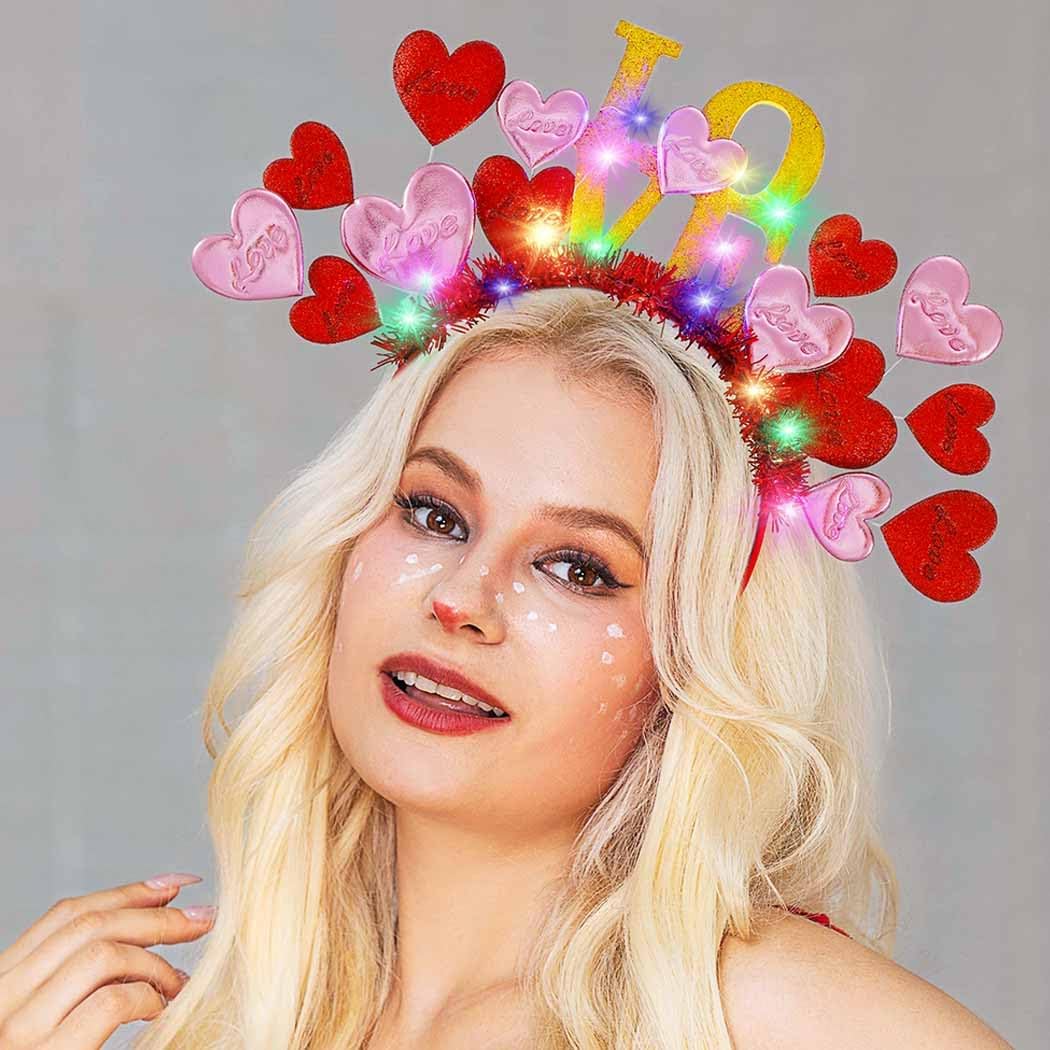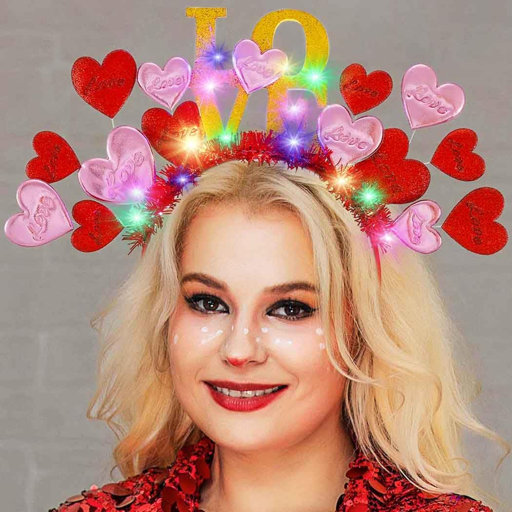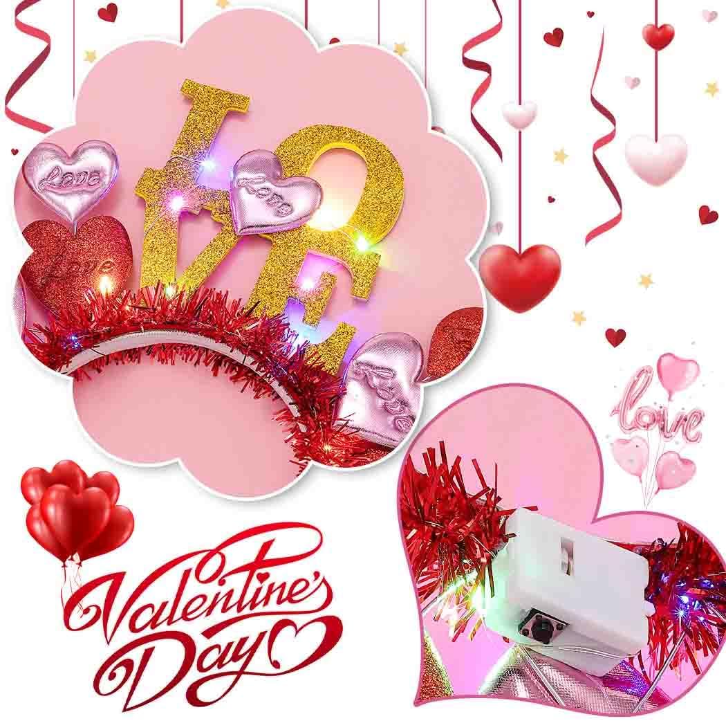 Light up headband with three twinkle modes, fast flash/slow flash/continuous on, you can easily switch mode by pressing the button on the side of the heart hair hoop, it can keep flashing lasting for several hours while.