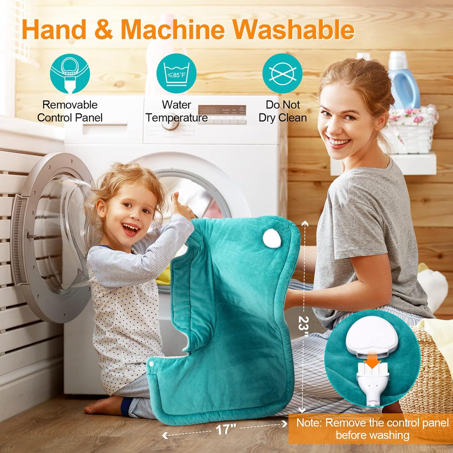 The controller is easy to operate, fast heating to 6 different levels to suit your different needs and quickly provides soothing temporary relief to sore muscles. 4 timer options allow you to take a nap without worrying about overheating and scalding.