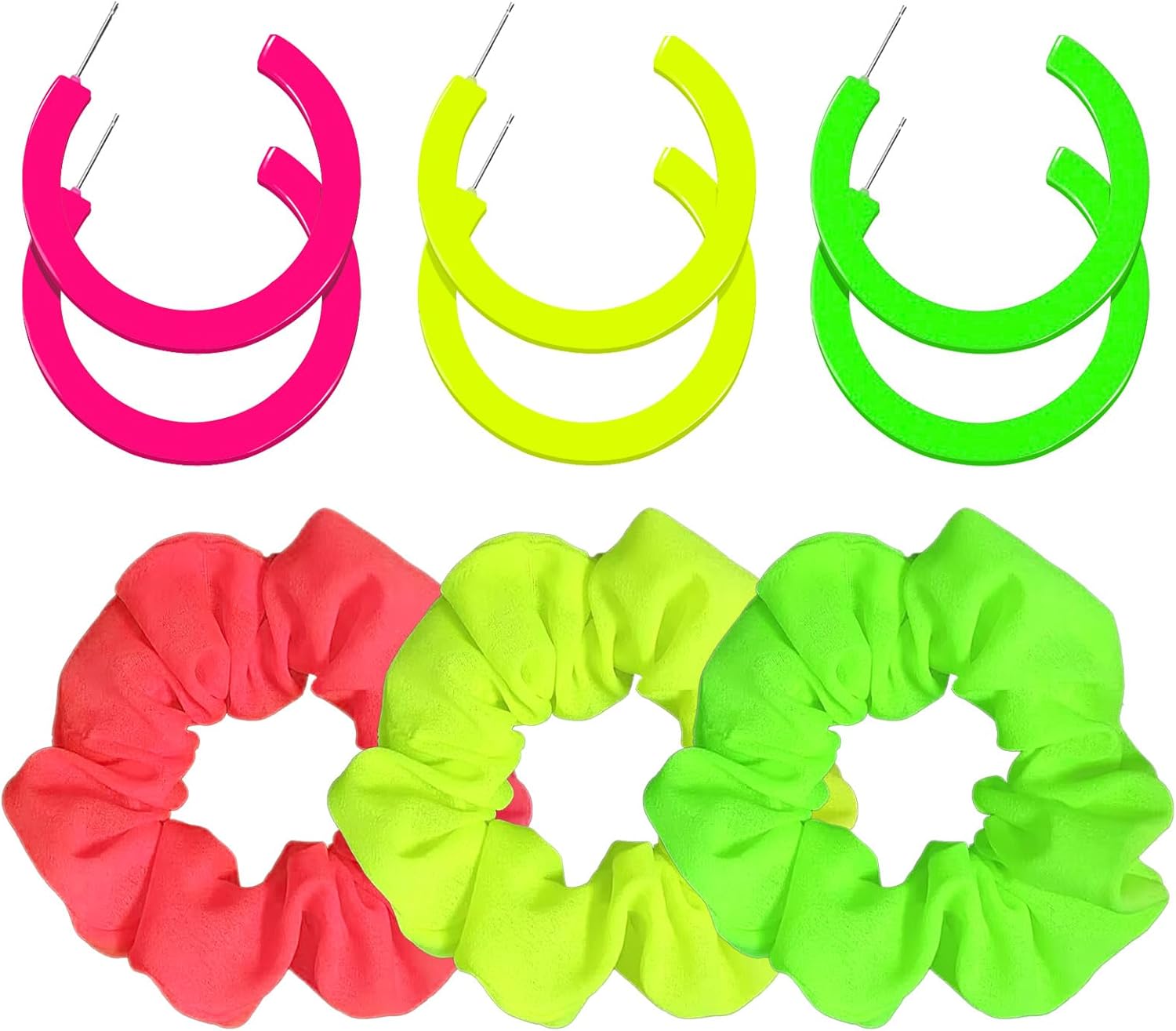 Style Neon Bracelets 80s Neon Scrunchies &Earrings Neon Jewelry Set 70s 80s Tape Earrings Lightning Earrings