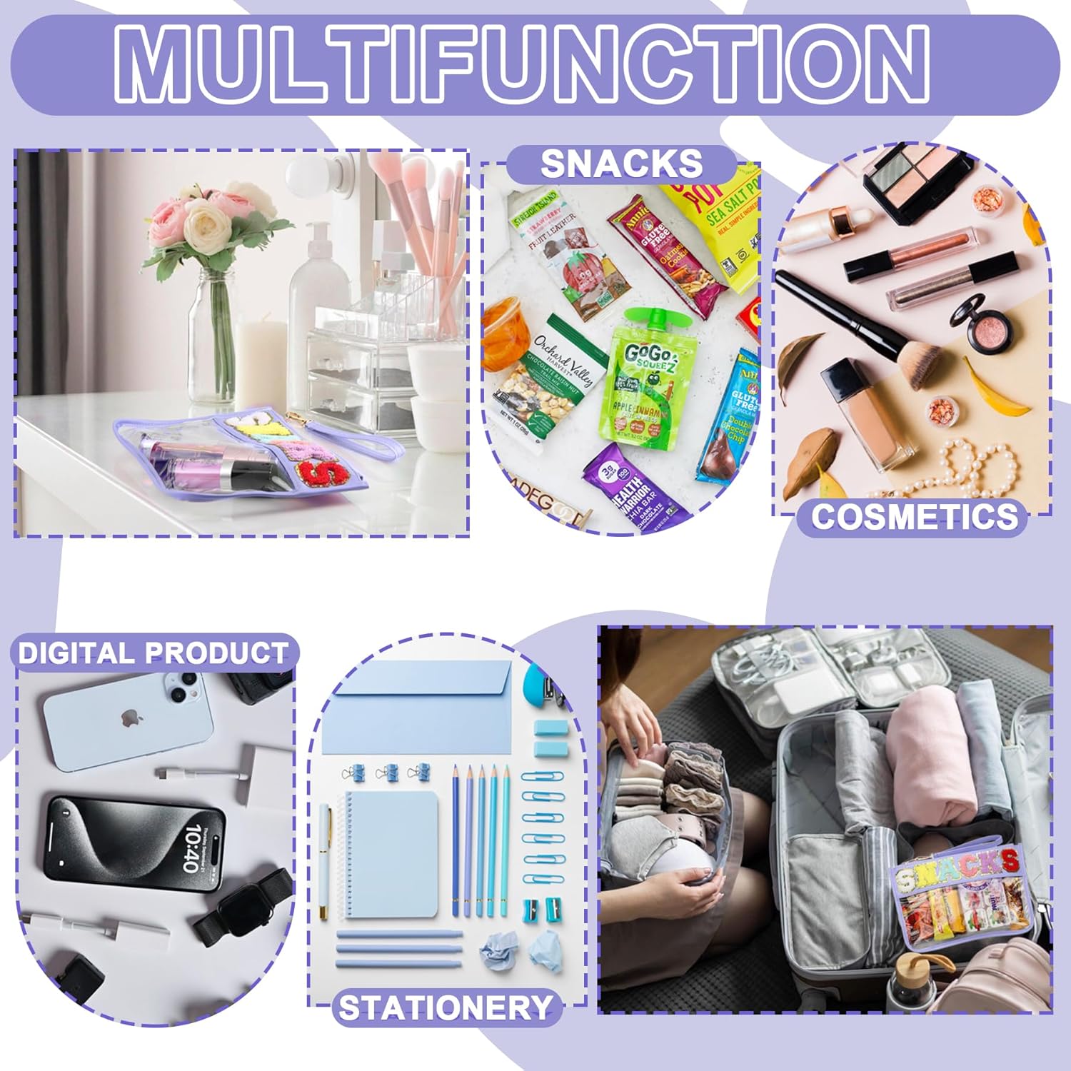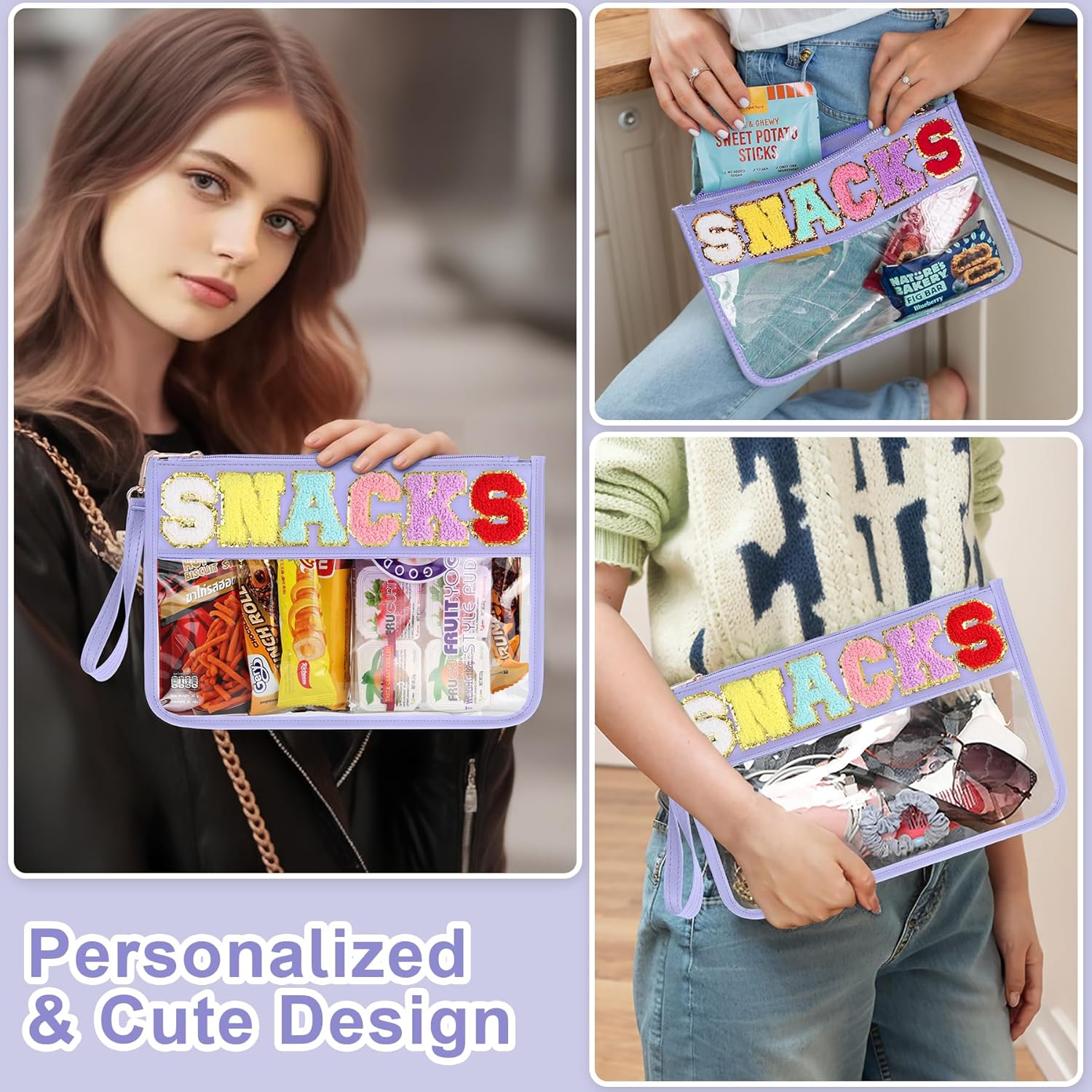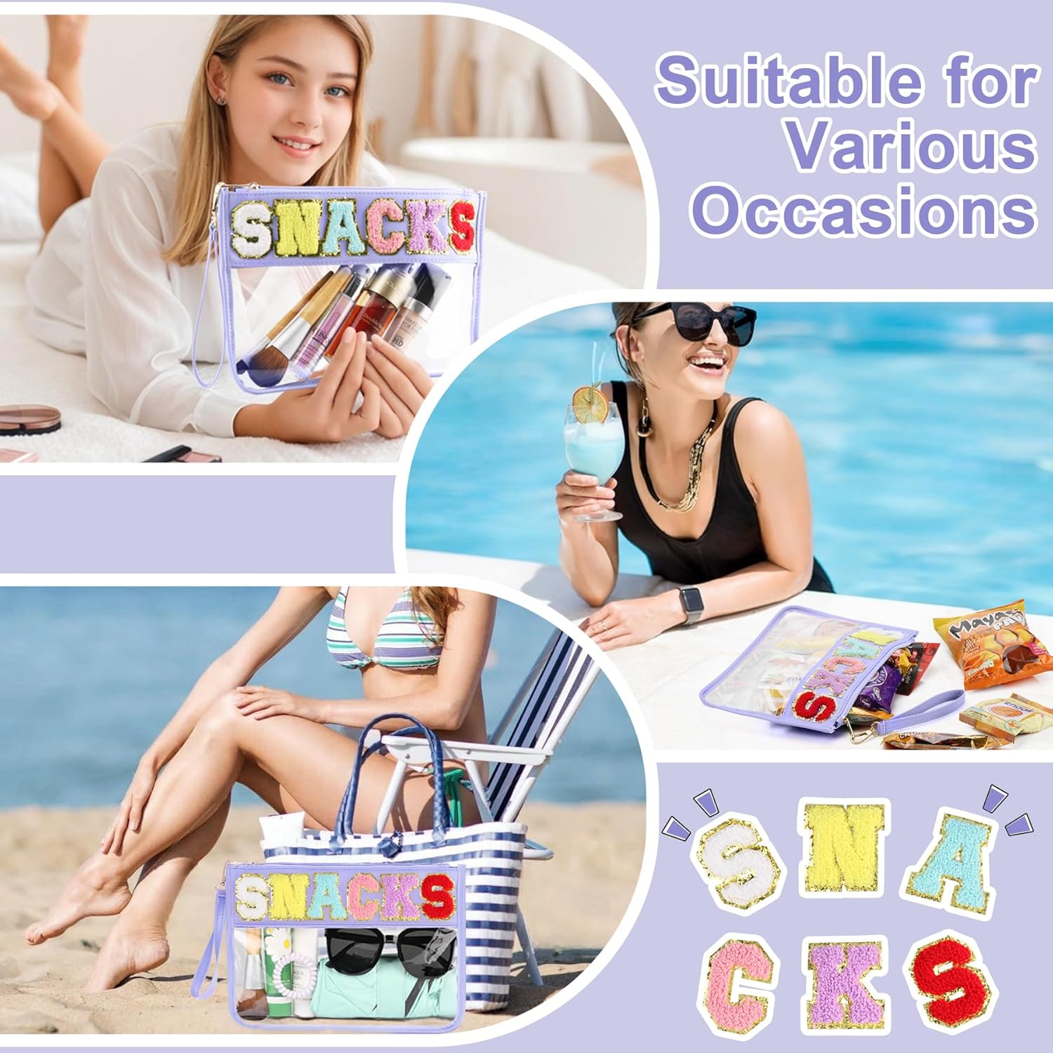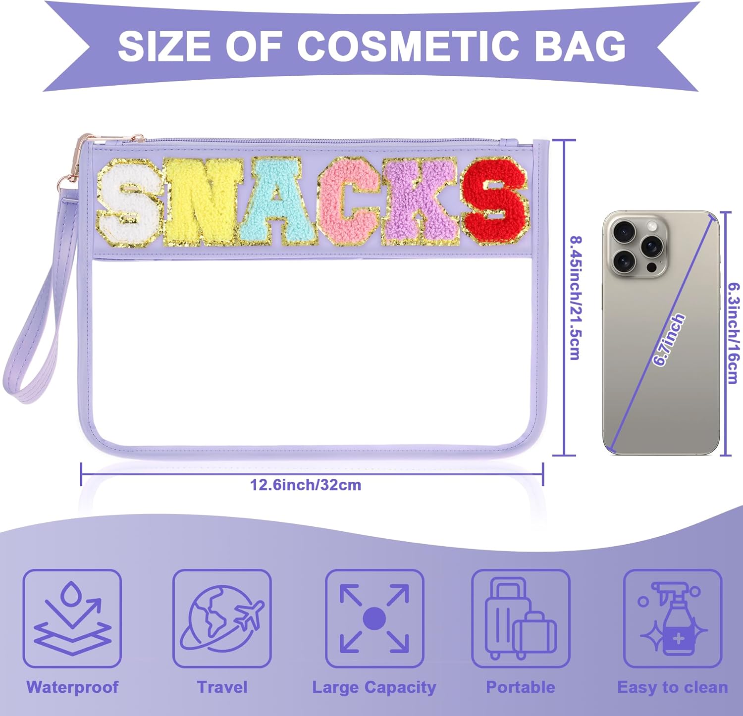 Snack Bag for Travel - Clear Chenille Varsity Letter Flat Pouch with Zipper, Waterproof Clear Nylon Preppy Patch Makeup Cosmetic tote Bags for Women Girls